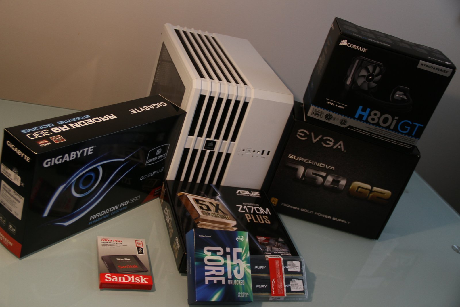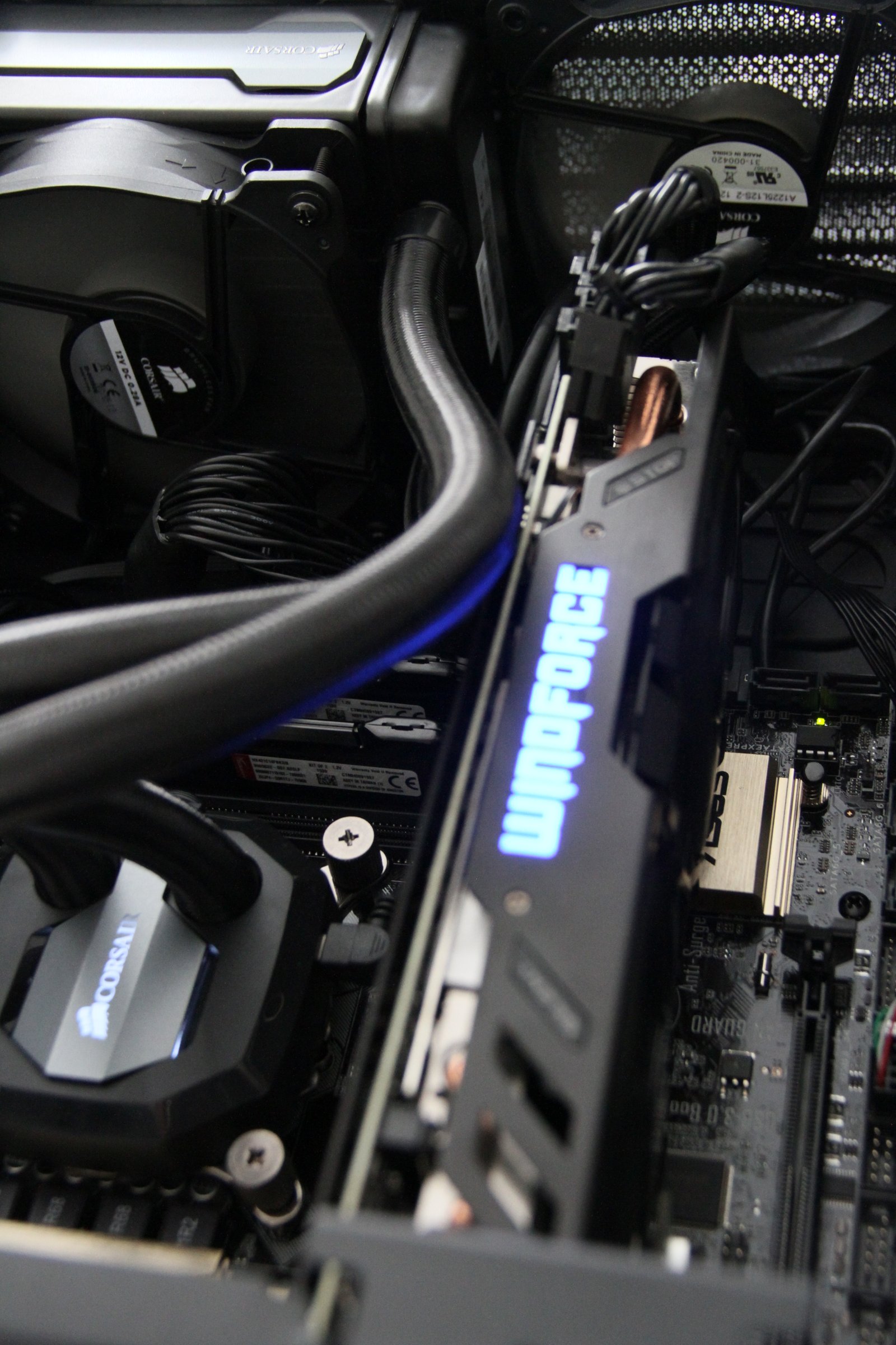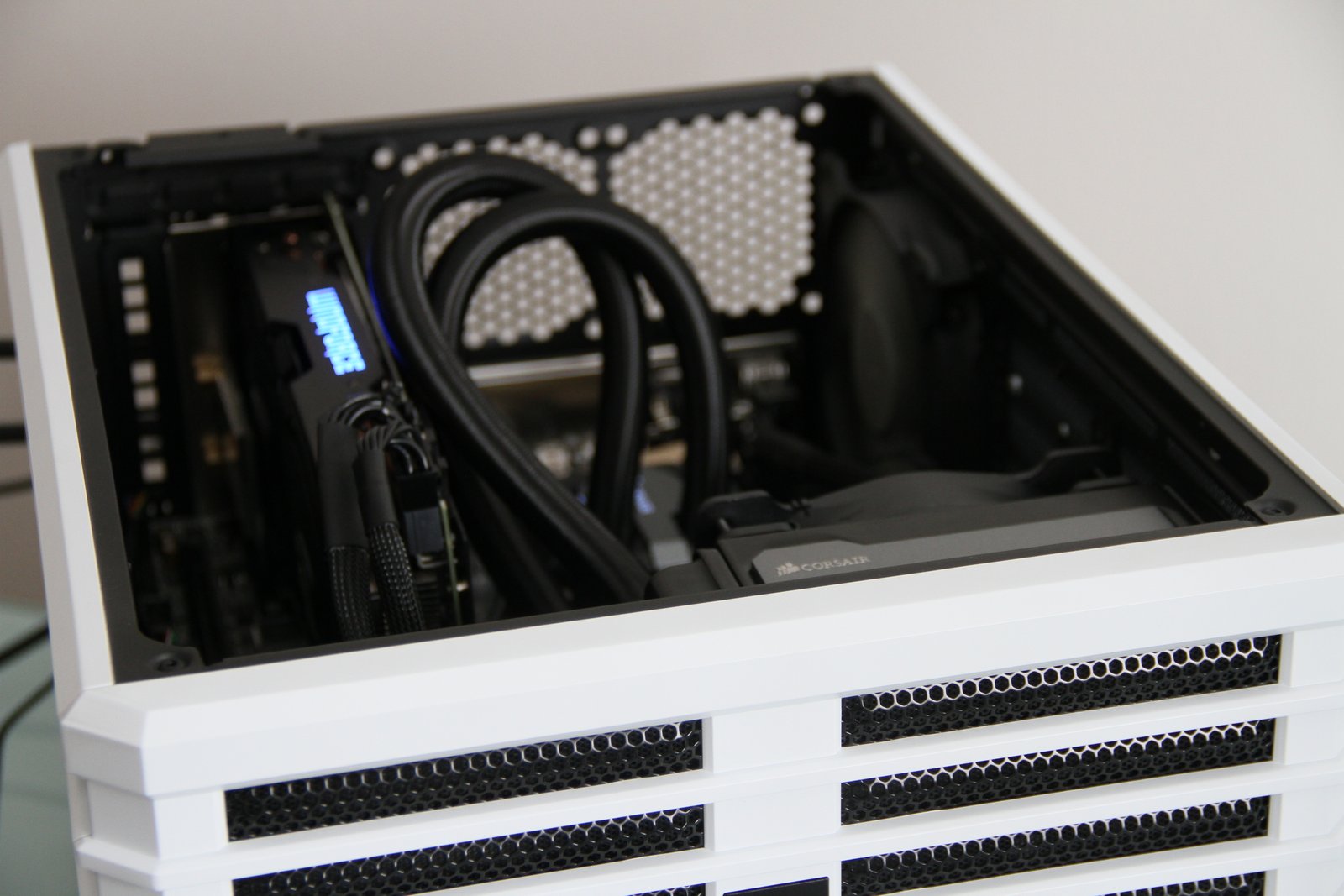 PC Case: Corsair Air 240 – I absolutely love this case. The Corsair Air 240 is a compact Micro ATX PC case with a cube like shape. You can orient this case any way you want (horizontally or vertically), it has a nice looking side window (or top windows depending on what orientation you use) and there is still so mech space inside for everything you need and a little more. I chose this case not only for its aesthetic appeal, but also because it is a compact case that leaves room for upgrades (including plenty of drive space, two graphics cards and plenty of fans for cooling). The Corsair 240 comes in either white or black, has great air flow and includes three 120mm fan – one of which I took out to make way for the Corsair H80i GT liquid cpu coolers radiator / fans.