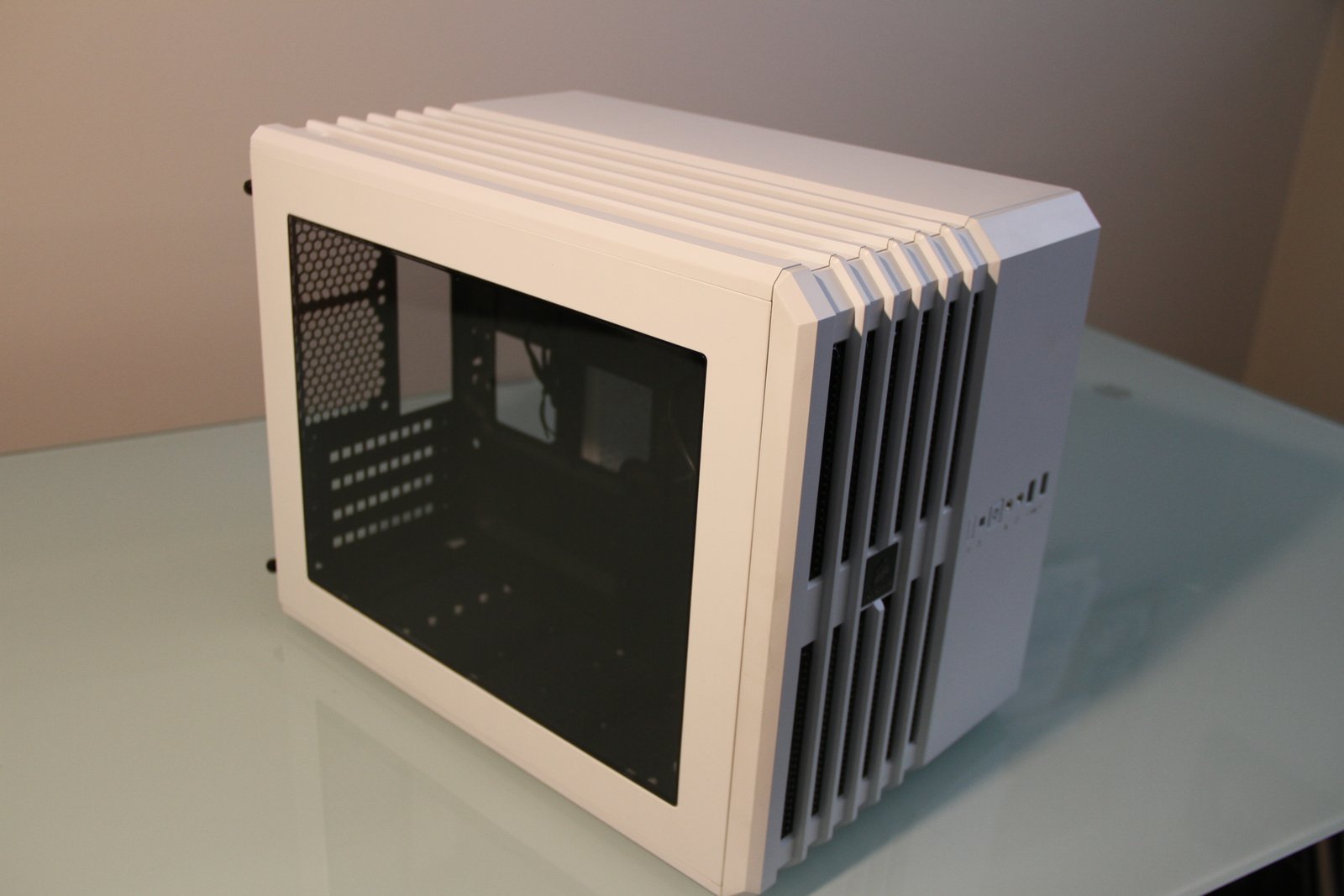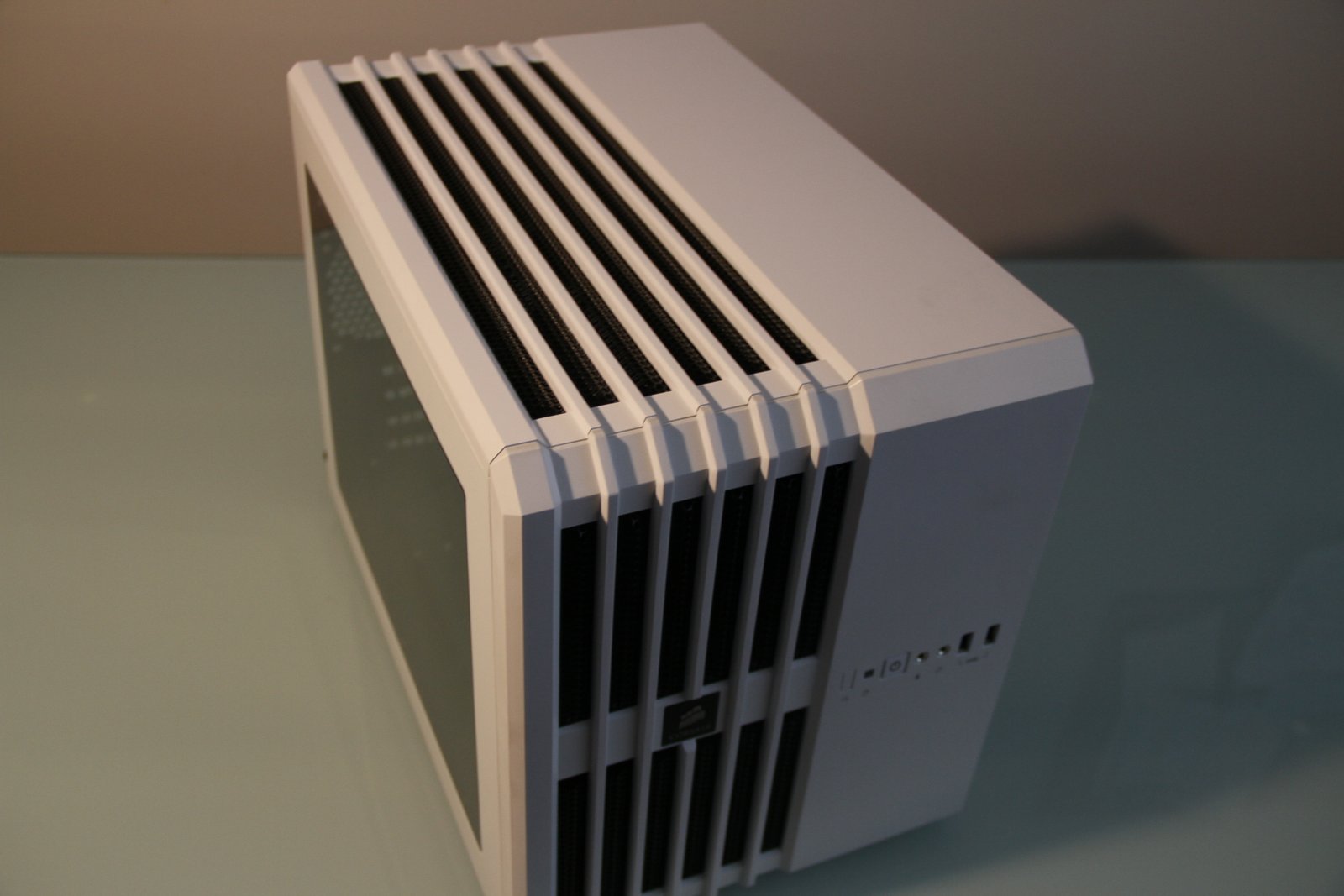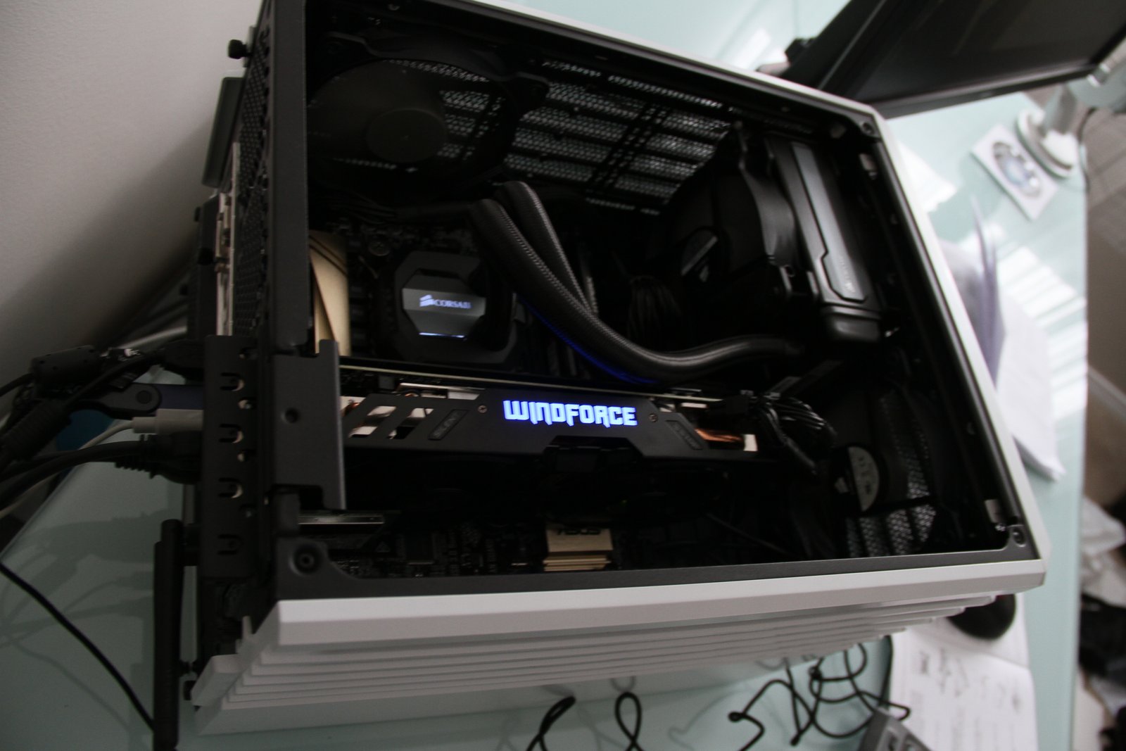 PC Case: Corsair Air 240 – I absolutely love this case. The Corsair Air 240 is a compact Micro ATX PC case with a cube like shape. You can orient this case any way you want (horizontally or vertically), it has a nice looking side window (or top windows depending on what orientation you use) and there is still so mech space inside for everything you need and a little more. I chose this case not only for its aesthetic appeal, but also because it is a compact case that leaves room for upgrades (including plenty of drive space, two graphics cards and plenty of fans for cooling). The Corsair 240 comes in either white or black, has great air flow and includes three 120mm fan – one of which I took out to make way for the Corsair H80i GT liquid cpu coolers radiator / fans.