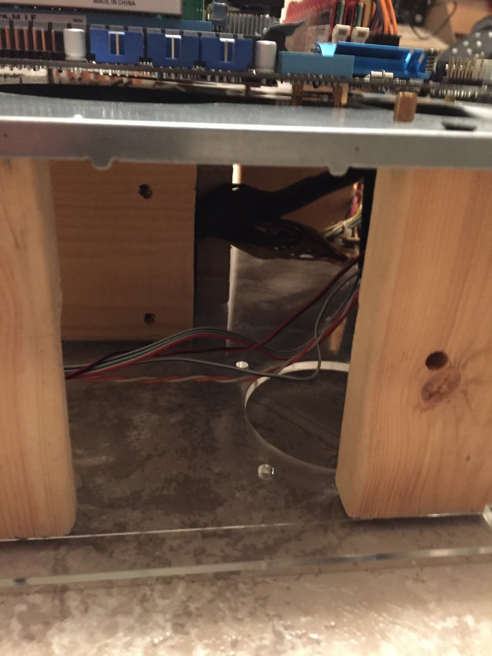 In order to attach the wood to the plexiglass and motherboard tray, I used screws with drill ends on them (no need to pre-drill) and slowly screwed the wood legs into each of the four corners through the metal motherboard tray and the plexiglass bottom. I was a little rough on the last screw going into the plexiglass and did crack it a bit, but nothing that glue couldn’t fix.