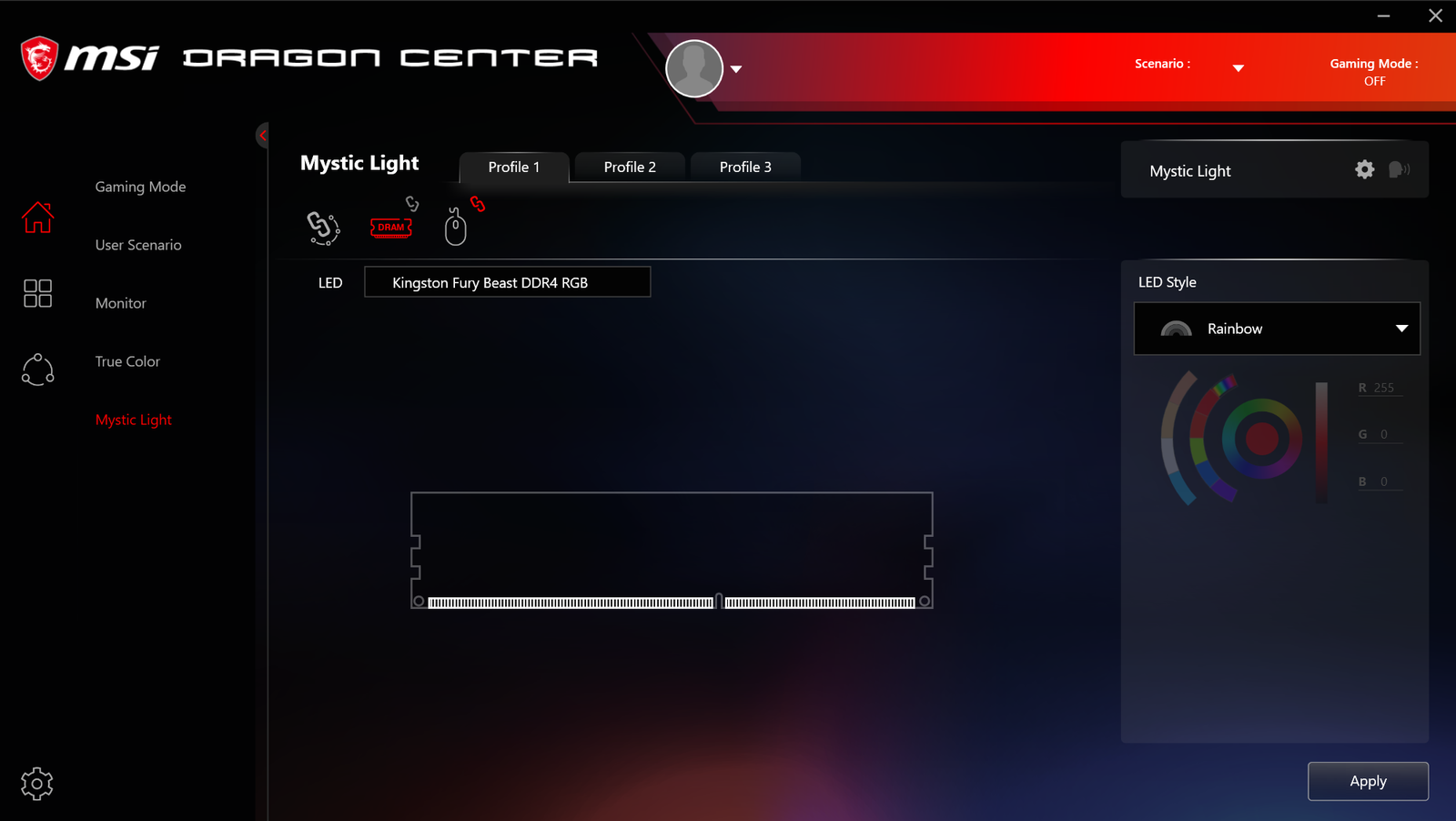 Booting up Mystic Light, I immediately see the memory is seen and shown and ready for customizing its RGB lighting. And using the built-in pre-sets I was easily able to select exactly what effect or color I wanted the memory sticks to show. II quite like the default rainbow type effect that the FURY Beast kits emit upon first loading up, but if you were looking to match your RGB kit to some current lighting setup you have, it is easily done here.